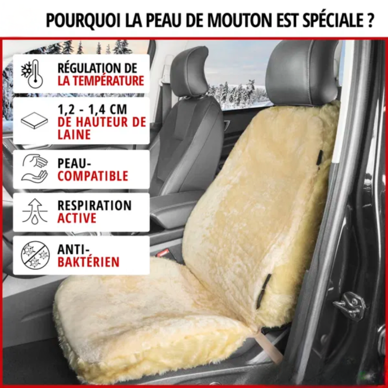 Housse de siège très confortable avec une peau d'agneau douce et naturelle pour des trajets agréables.