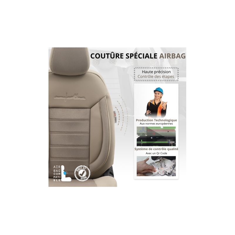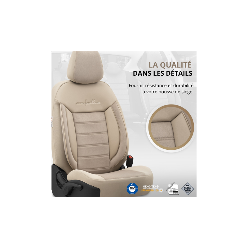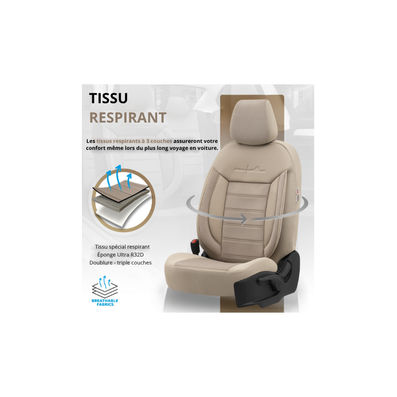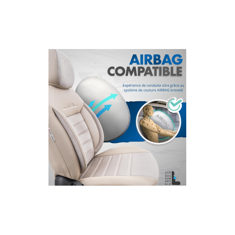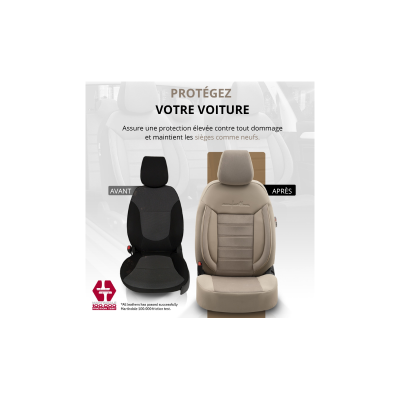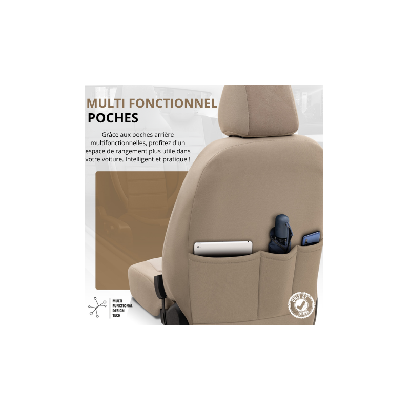 Vos sièges restent fonctionnelles : airbags, accès aux vide-poches et tablettes, molettes de réglage, custodes, boite à gants, accoudoirs, formes des appui-tête (virgule, ergonomique, plein…). Vos sièges seront complètement recouverts et vous n'apercevrez plus votre sellerie d'origine. La coupe est spécifique à votre véhicule, c'est à dire que les housses auto sont aux mesures de votre voiture.