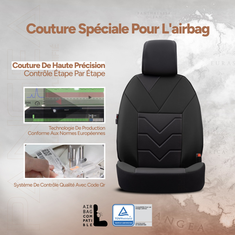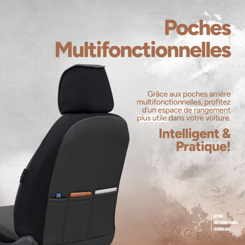 Offrez à votre voiture un look premium et un confort exceptionnel avec la housse universelle PANGEA. Une conception soignée digne du sur-mesure et un confort supérieur : fabriquée en simili cuir de haute qualité et de 7 couches de tissu renforcées, elle protège intégralement vos sièges avant tout en restant compatible avec les airbags latéraux et la majorité des véhicules (hors monospace).