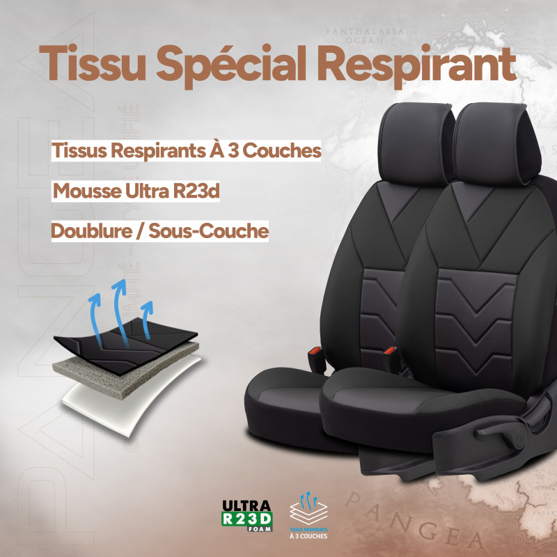 Tous les tissus sont doublés d'une mousse épaisse, assurant confort et longévité au produit. Les matières répondent aux exigences du monde de l'automobile : test de résistance aux UV et aux frottements. Les tissus de la gamme Pangea sont composés de 2 parties : - la partie centrale, de couleur unie avec une épaisseur de mousse de 8 mm et - les bords aussi appelés soufflets dans un coloris uni également, avec une épaisseur de mousse de 2 mm