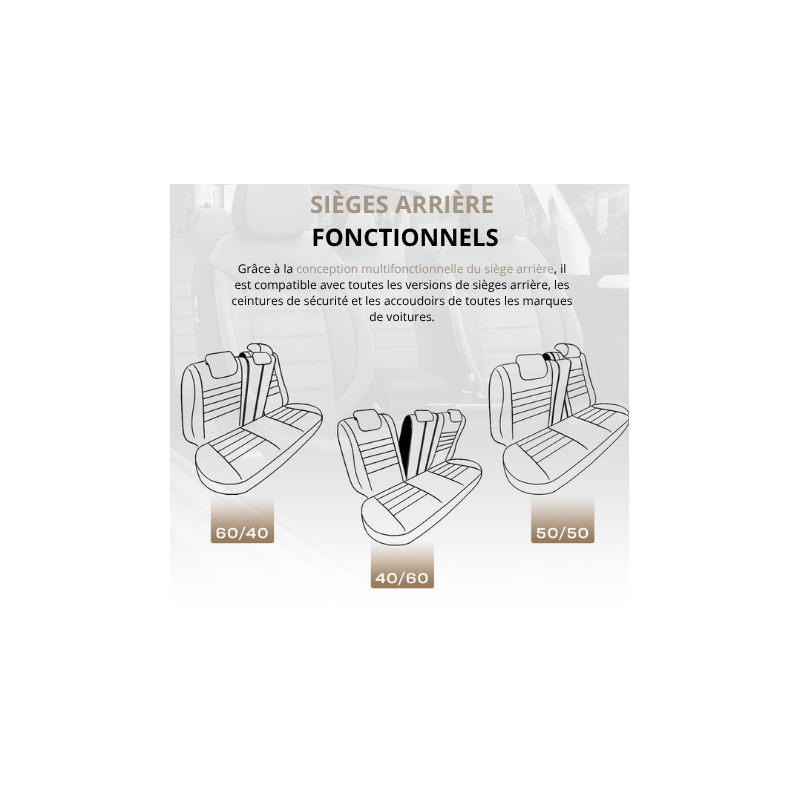 Vos sièges restent fonctionnelles : airbags, accès aux vide-poches et tablettes, molettes de réglage, custodes, boite à gants, accoudoirs, formes des appui-tête (virgule, ergonomique, plein…). Vos sièges seront complètement recouverts et vous n'apercevrez plus votre sellerie d'origine.