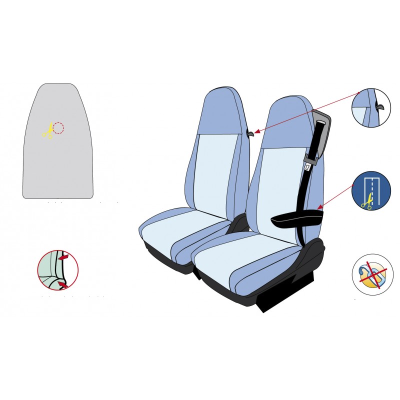 Les fonctionnalités de vos sièges restent fonctionnelles : airbags, accès aux vide-poches et tablettes, molettes de réglage, custodes, boite à gants, accoudoirs, formes des appui-tête (virgule, ergonomique, plein…). Vos sièges seront complètement recouverts, ainsi vous n'apercevrez pas votre sellerie d'origine.
